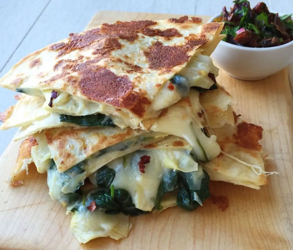 Everything you love about spinach-artichoke dip sandwiched in a quesadilla.