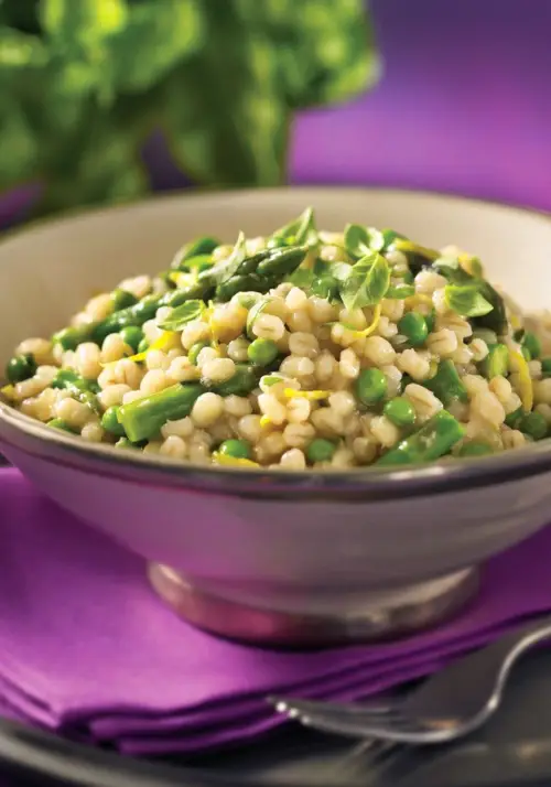 Combine the bright flavors of lemon, basil, and asparagus with the earthiness of barley and onions.