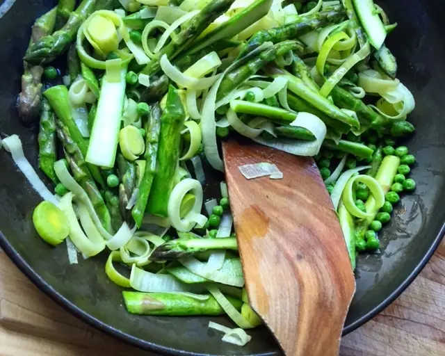 This easy spring saute with leeks, asparagus, and peas is enriched with butter and brightened with lemon zest.