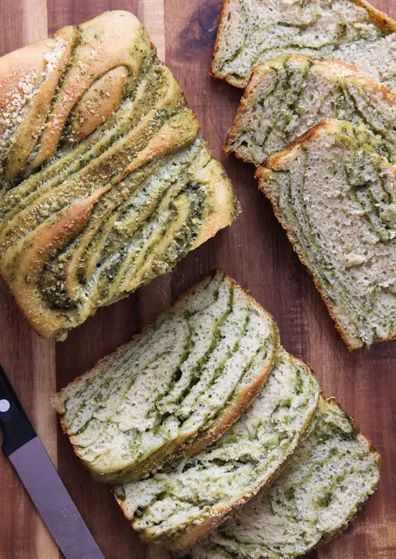 An easy, tender, and flavorful savory bread, featuring thick streaks of basil pesto sauce throughout, braided into a loaf and baked to perfection. Eat it as is, slathered with butter, warm or cold. Just make it, eat it and enjoy it!