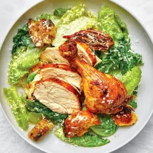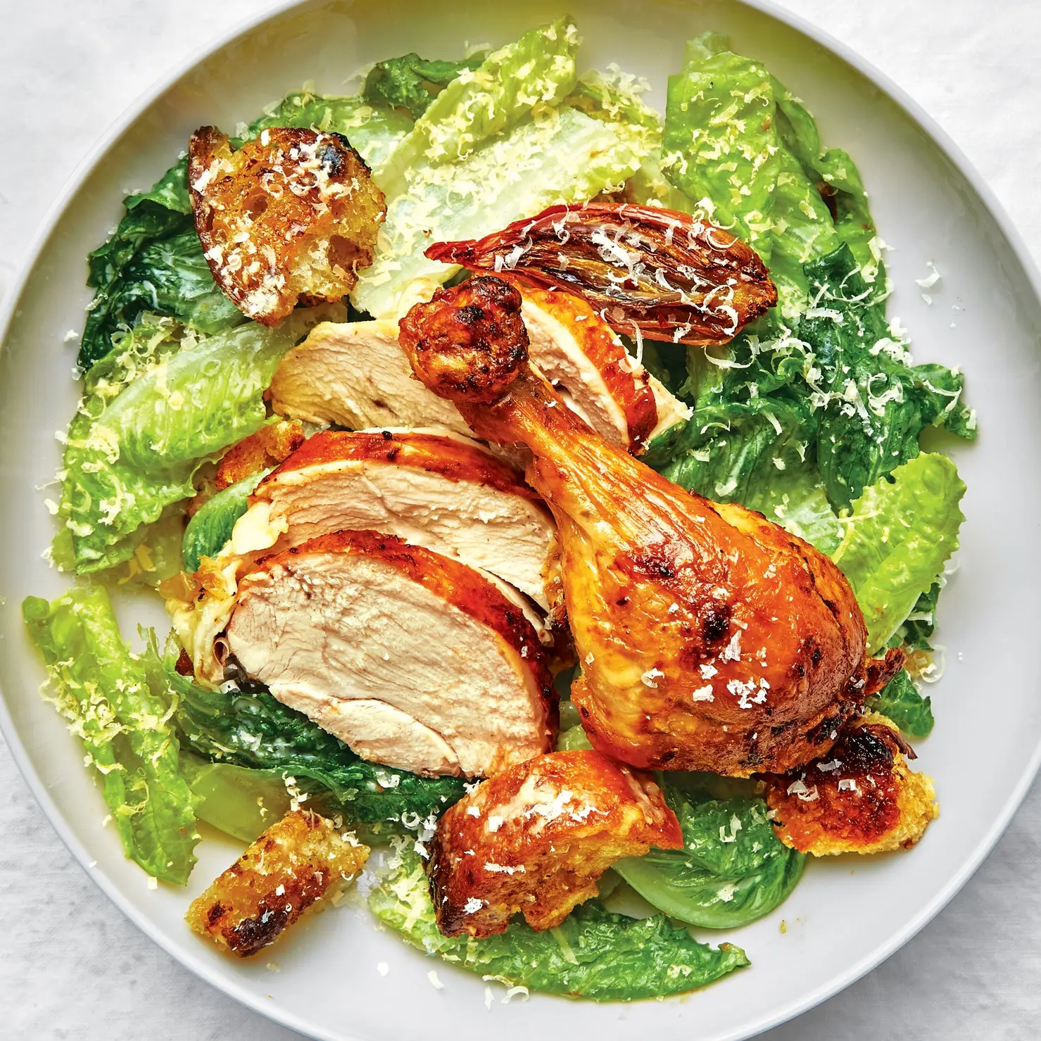 The only thing better than a roast chicken and a Caesar salad is a Caesar salad served with a chicken smothered in Caesar dressing and roasted until the garlic, anchovies, and mustard become deeply caramelized and flavorful.