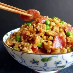 Chinese sausage is a wonderful ingredient. Its sweet, salty, and slightly smoky. For the best flavor, start with a dry sauté pan or wok set on medium heat. Add sausage and turn to low. The fat will render and in about 5 minutes, you can remove the sausage, leaving the fat. This is where a ton of flavor is! Use this fat to fry the rest of the ingredients.