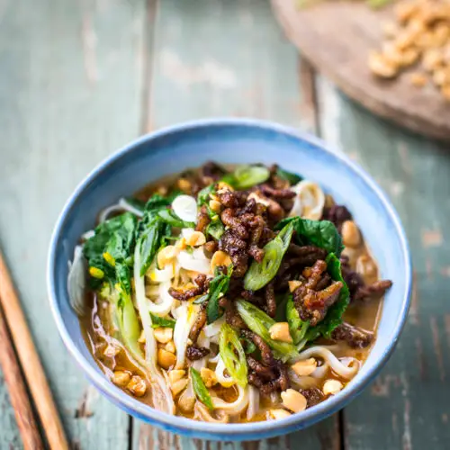 - Divide the sauce between four bowls followed by the noodles, bok choi, minced pork, spring onions, and chopped peanuts. Serve straight away.