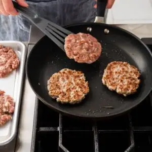 - Add 3 patties to skillet and cook until browned on both sides and meat registers 160 degrees, about 4 minutes per side.