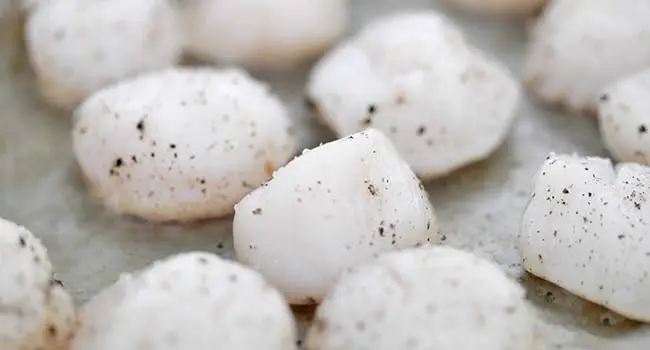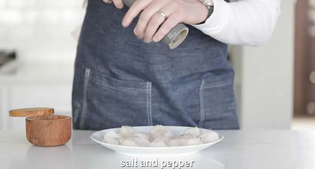 • Season the scallops on both sides with salt and pepper.