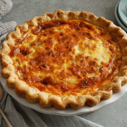 Quiche lorraine (named after the Lorraine region of France) is a popular variant that was originally an open pie with eggs, cream and lardons. In English-speaking countries, modern preparations of the dish usually include mature cheese (Cheddar cheese often being used in British varieties), and the lardons are replaced by bacon.This version uses bacon and ham with caramelized onions, Colby-Jack, and a bit of briny feta for contrast.