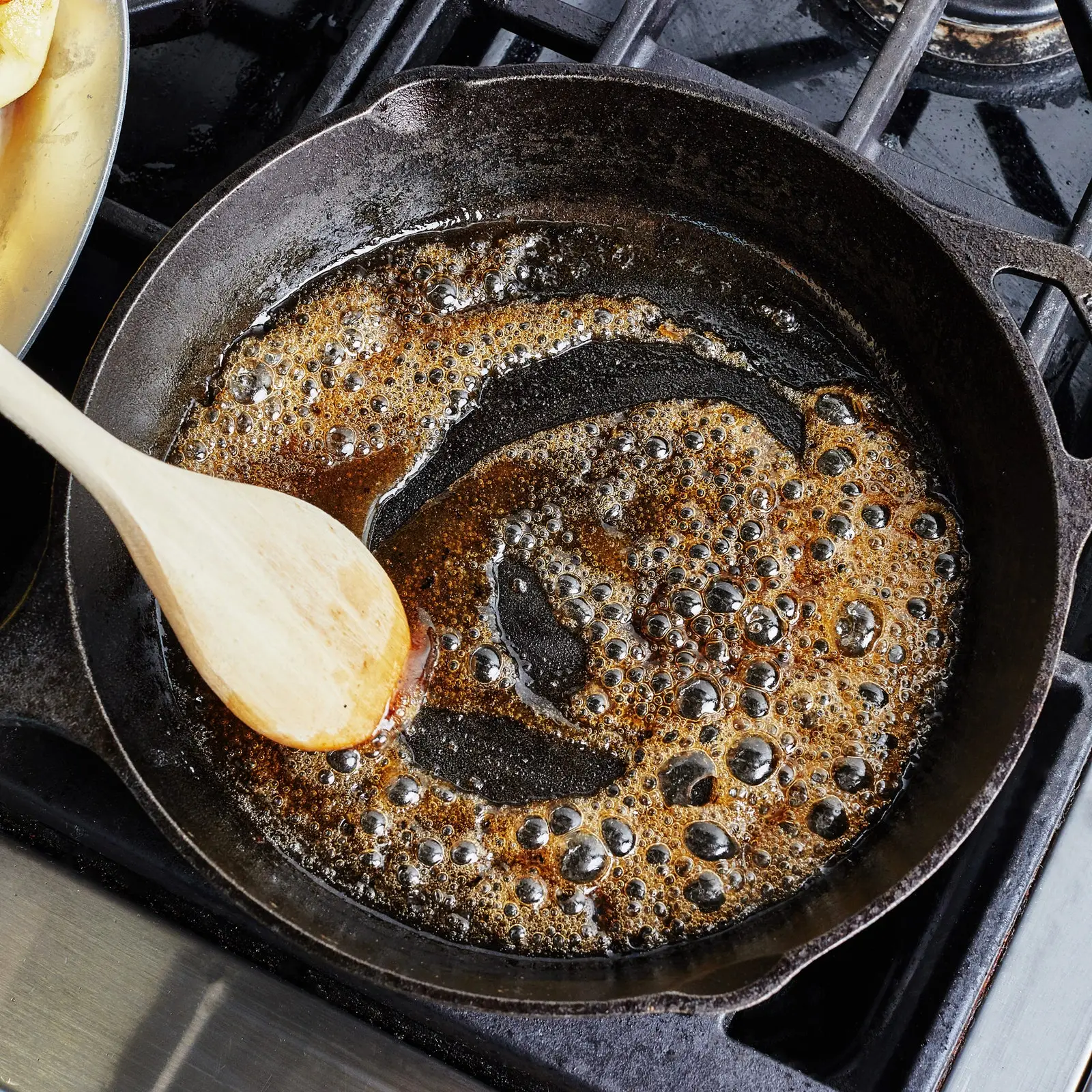 • Stir with a wooden spoon or heatproof rubber spatula until sugar is dissolved, then cook, swirling skillet occasionally (do not stir at this point), until thick and bubbling in a thin layer, about 1 minute.