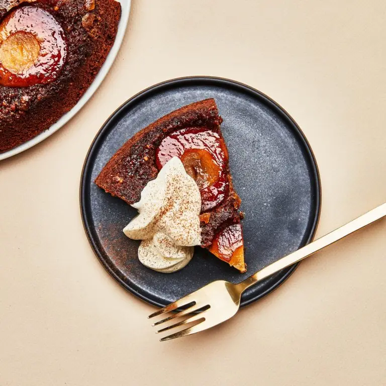 • Serve cake warm or room temperature. Slice into wedges and top with dollops of whipped cream and a dusting of cinnamon.