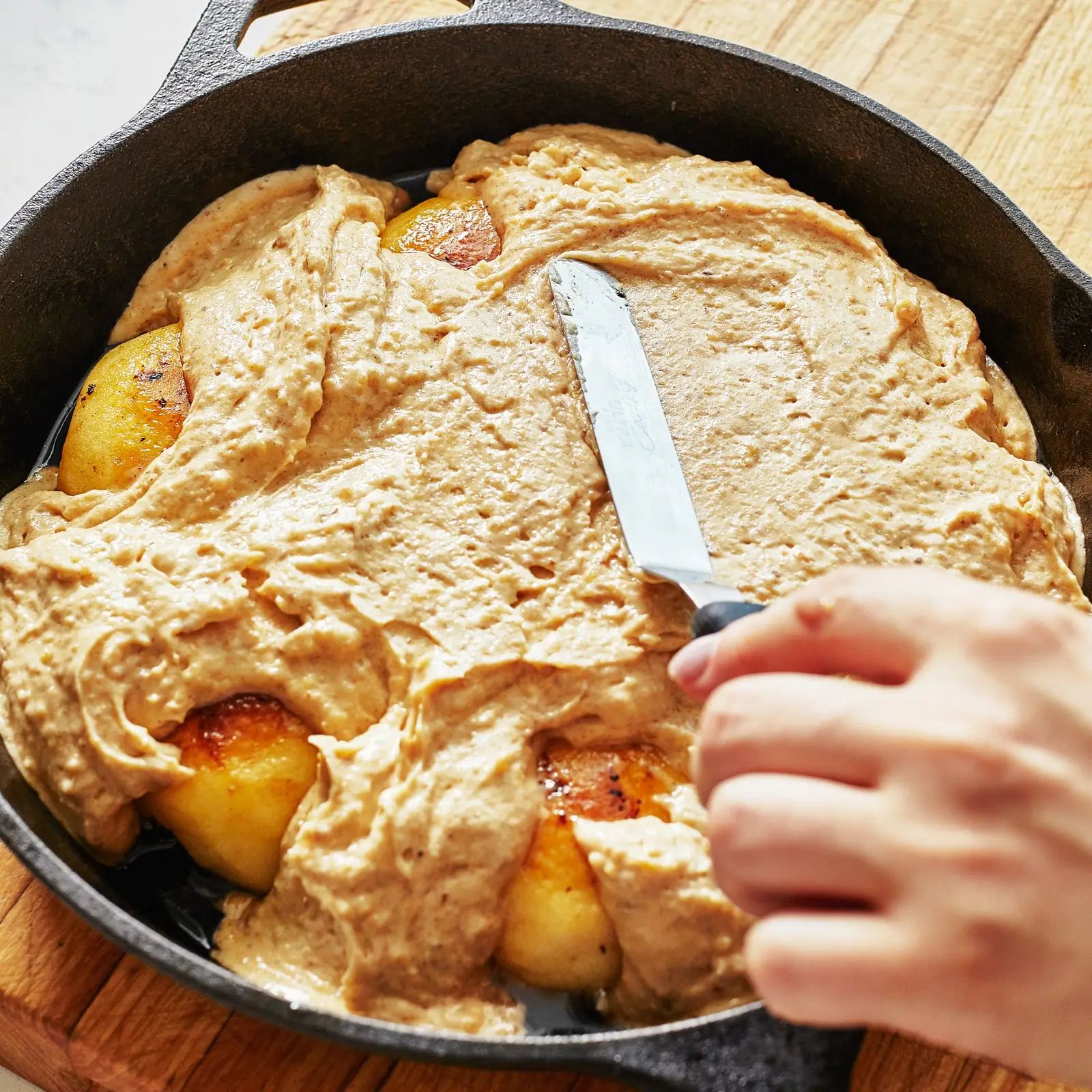 • Scrape batter over apples and work into spaces around apples.