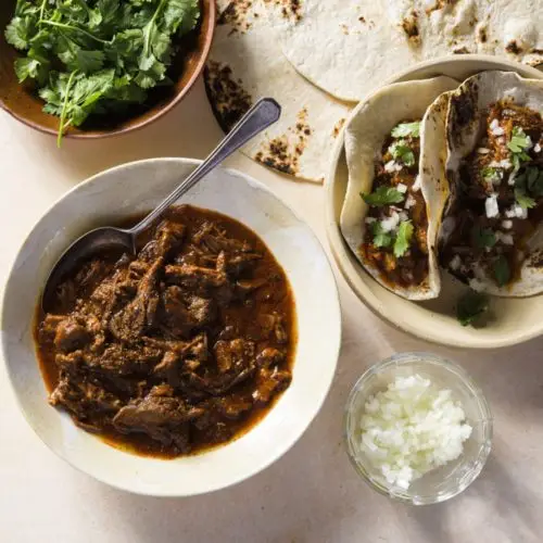 Carne en chile colorado is a Mexican classic, and one of the delicious offerings that appear on the rotating menu at Walter Soto’s El Ruso taqueria trucks that operate in a couple locations in and around Los Angeles. “Colorado” translates from the Spanish as “red-colored,” an apt name for the succulent, stewy dish of meat, sometimes shredded, sometimes not, in a sauce of pureed dried red chilies. Pork is commonly used to make chili colorado, but this version is Paola Briseño-González's ode to El Ruso's rich, robust beef in red chili sauce. The cut of choice is a boneless chuck roast, which boasts plenty of fat and connective tissue so that long, slow cooking yields rich, tender, full-flavored meat. Either guajillo or New Mexico chilies work here; you can even use a combination. Both are a deep red color, have bright, fruity notes with subdued earthiness, and contain only mild chili heat. El Ruso also is well known for its flour tortillas, so that’s the type to serve with the chili colorado for making tacos.