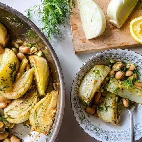 This dish really highlights the amazing flavor of fennel as it transforms from fresh and crispy to sweet, meaty and caramelly when slow cooked.It’s simple and so spectacular. This dish is no waste as well, using the fennel tops at the end to add a fragrant, fresh element to the dish.Serve with fish, chicken, roast meats, spoon over marinated feta and enjoy on its own or slice the cooked fennel and spoon it with the butterbeans and fennel tops, through some cooked pasta with more lemon, olive oil and some parmesan to finish.