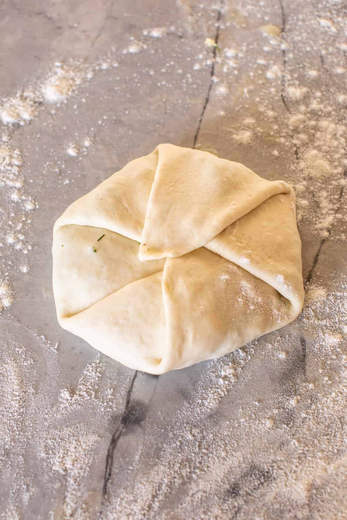 - Fold up the dough around the cheese, pinching to seal it in.