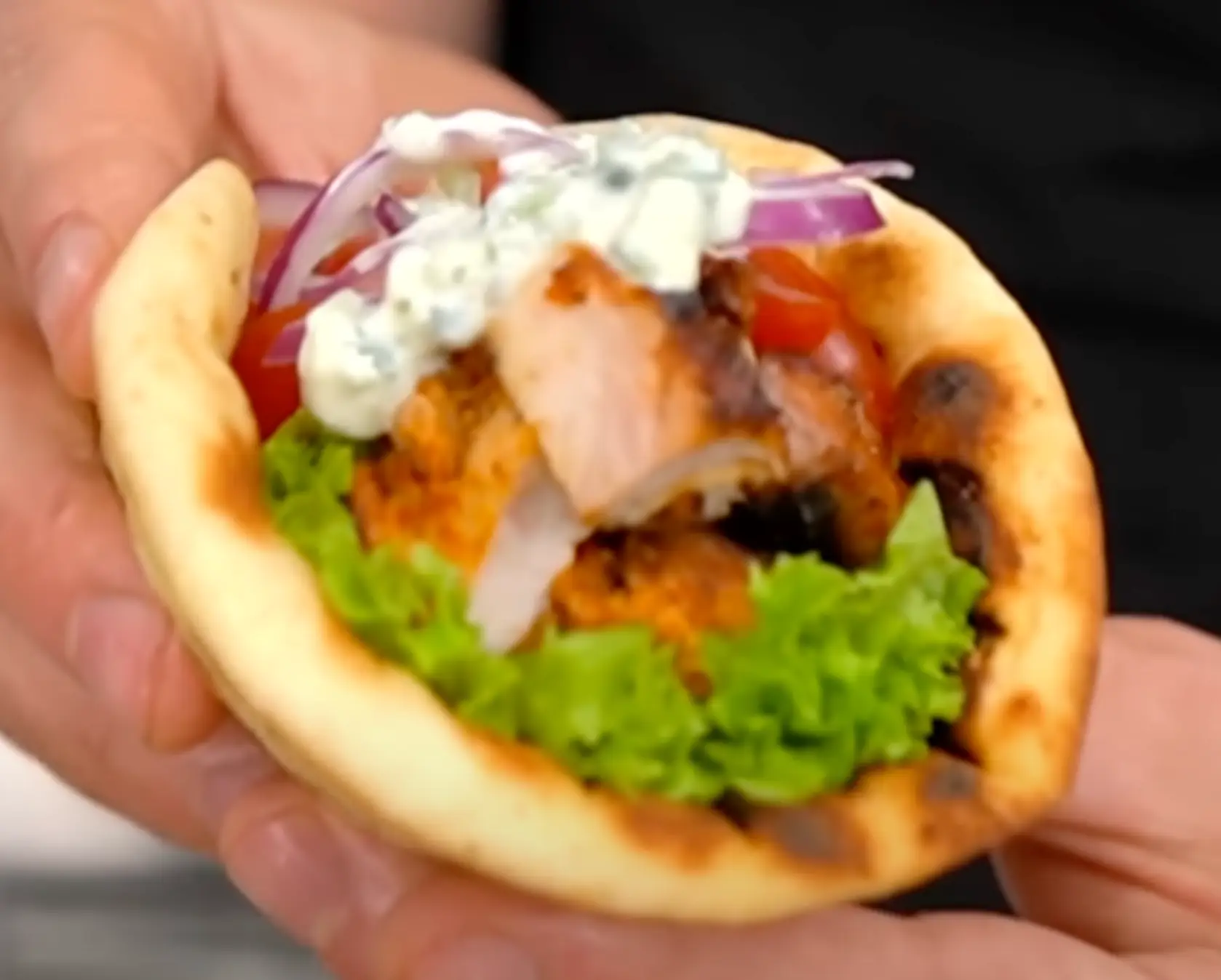 - Layer the toasted pita with lettuce, chicken, tomatoes, onion, and sauce. Close up the pita and enjoy.