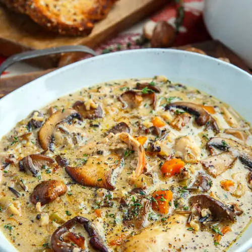 A warm and creamy mushroom, chicken and wild rice soup that is down right one of the best comfort food around!I certainly have been enjoying making a lot of soups lately and my favourite has to be this creamy mushroom chicken and wild rice soup which is a combination of two amazing soups, cream of mushroom soup and chicken and wild rice soup! This soup has the best of both worlds with chicken, wild rice and plenty of veggies from the one soup to the mushrooms and creamy broth from the other soup and the combination is just magical! I like to use a variety of mushrooms from button, to cremini, shiitake, oyster, etc. and I saute them in butter before moving on to the veggies. I season the soup with a generous helping of parmesan cheese which just melts into the broth infusing it with its umami packed flavor! One of the great things about this soup is how easy it is to make and it only takes about 40 minutes making it a good meal even when there isn’t a lot of time. If you are looking for a tasty soup to enjoy this fall or winter this creamy mushroom chicken and wild rice soup is a great way to go!