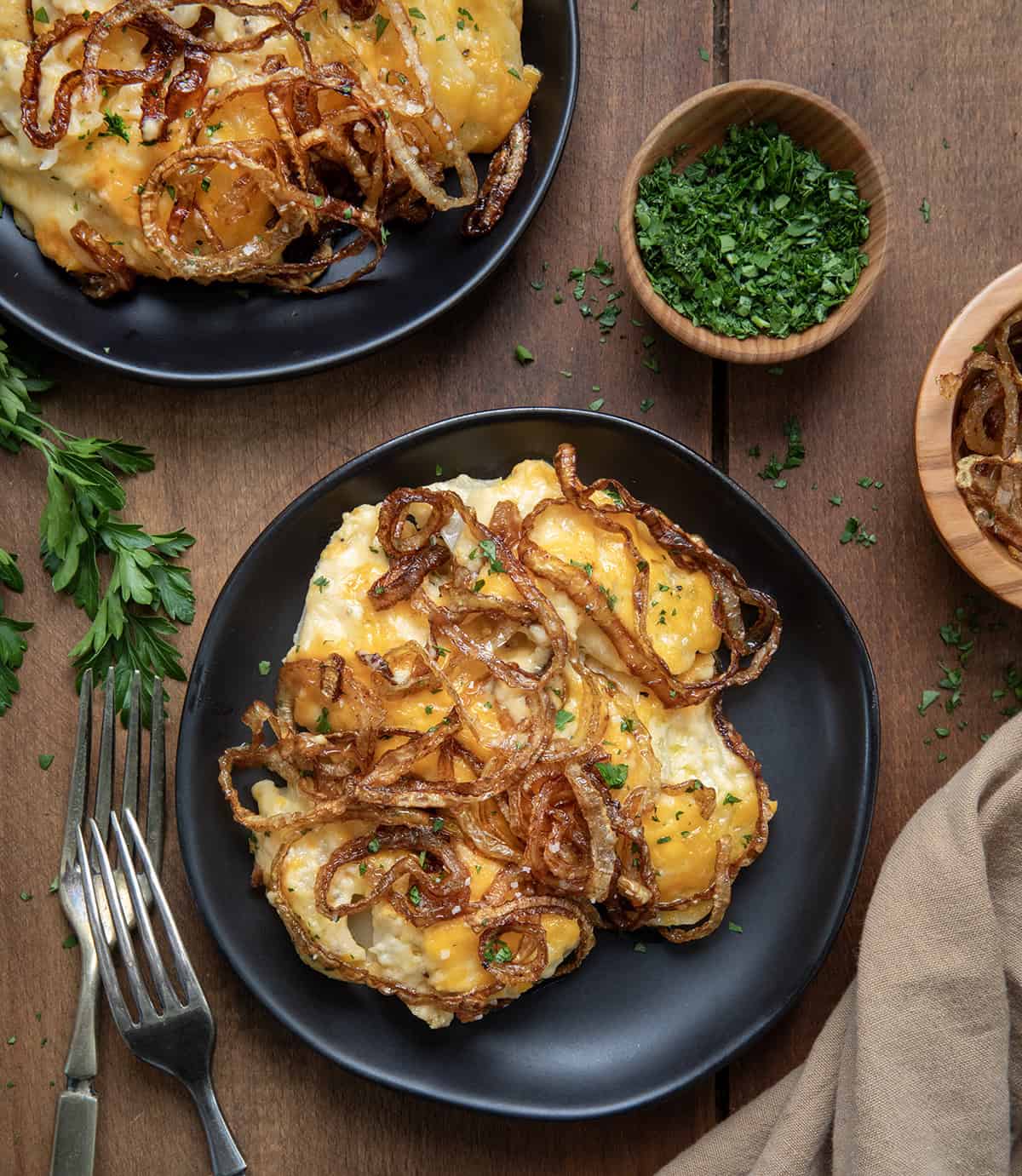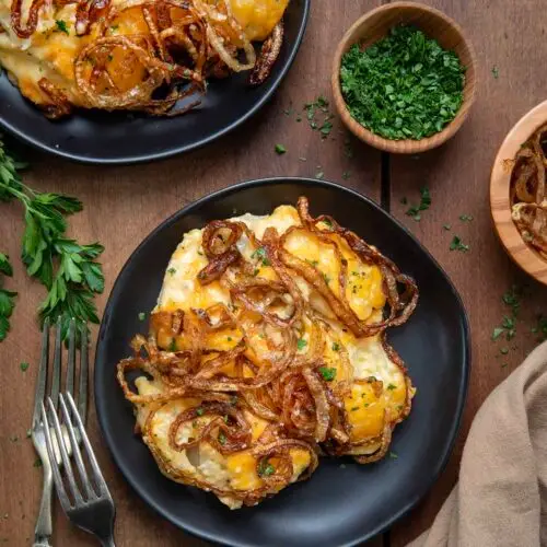 These Fried Onion Scalloped Potatoes are slices of russet potatoes smothered in a creamy cheese sauce, and topped with crispy, golden-fried onions – a delicious twist on a classic recipe.