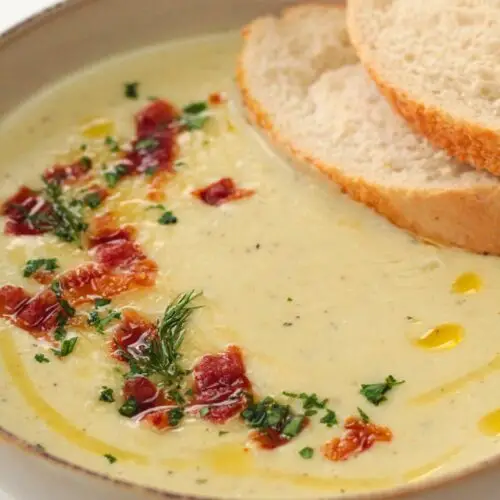 Roasted Garlic Soup is a perfect creamy soup made with caramelised, roasted garlic, potatoes and shallots. It’s blended until smooth with chicken or vegetable broth and heavy cream. It pairs really well with several toppings and sides, like crispy bacon, cheddar cheese, herbs and fresh baguette or grilled cheese. It’s ridiculously easy to make – just roast vegetables in the oven, blend and enjoy!