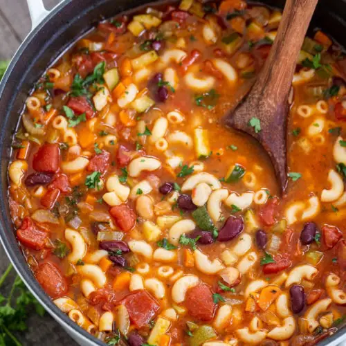 Minestrone soup is so hearty it can stand on its own as a main dish. I fell in love with minestrone at the Olive Garden, so this is a pretty darn close attempt at copying the classic Italian soup. Minestrone soup is not just tasty, it’s healthy as well! The delicious tomato-y broth is chock-full of vegetables and beans. Made in one-pot, healthy minestrone is a great option for a quick weeknight dinner as the weather starts to cool off.