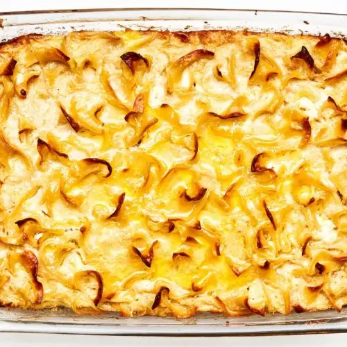 After an intense internal debate about how a noodle kugel should be—naked or cereal-topped? wide noodles or extra-wide noodles? souffléed or custardy? sweet or savory?!—this is where we landed. Our kugel is a touch sweet and a touch eggy, landing somewhere between airy and pudding-like. Don’t tell your guests, but we like the corner pieces—where the noodles get crispy from the heat of the pan—best. Save those for yourself.