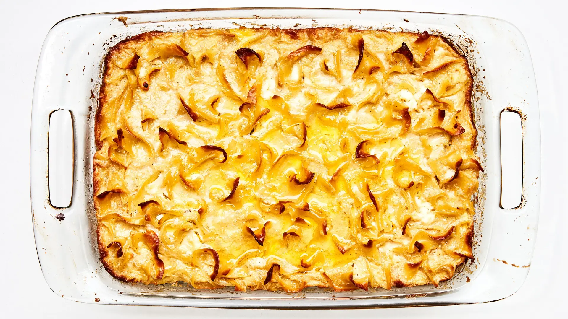 - Bake kugel, rotating pan halfway through, until the custard has souffléed, the top is browned, and the noodles on the surface are crispy, 50–55 minutes.