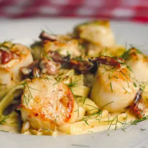 This recipe for pan seared scallops with bacon fennel cream sauce makes an ideal dinner party idea that doesn’t take much time at all. If you prep all your ingredients beforehand and have them at the ready beside the stove, the cooking time should really be about 15 minutes. The creamy fennel flavoured sauce is delicious with the sweet succulent scallops with the bacon cutting the richness just a little with its smoky saltiness.