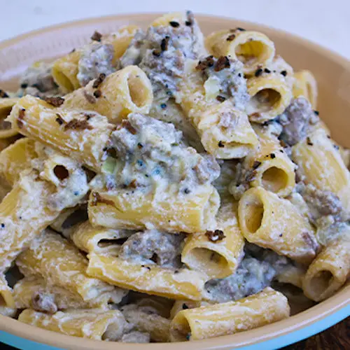 - Now your creamy, rich pasta alla norcina is ready to serve! Add a serving of this pasta dish to a plate, making sure to get extra sauce and sausage on top (the best part!).