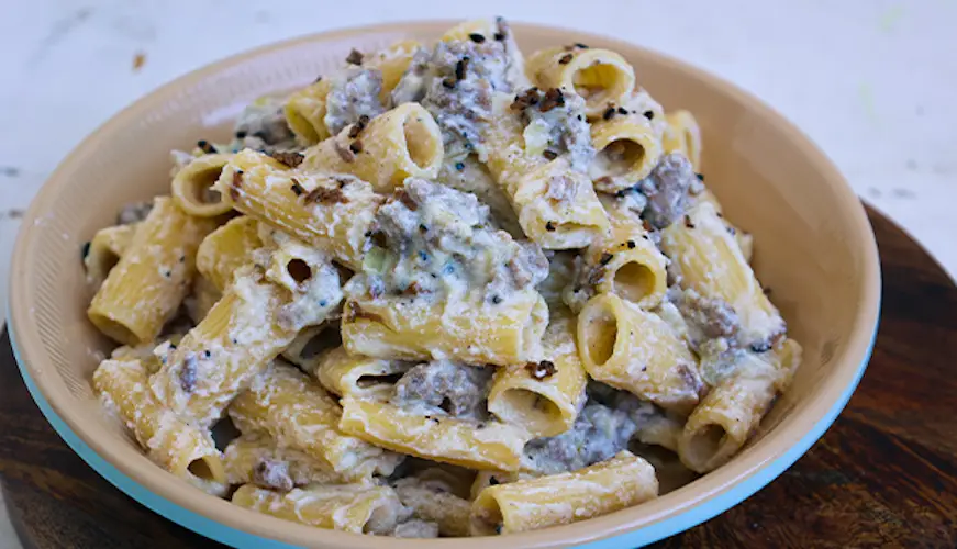 - The only thing missing is the extra truffle. Shave the desired amount on top, and it’s ready to eat. Now you have pasta alla norcina, the authentic Umbrian way.