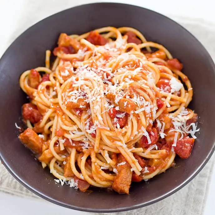 To create an authentic-tasting version of Pasta All’Amatriciana we needed an alternative to hard-to-find guanciale, or cured pork jowl. Humble salt pork, though an unlikely solution, provided the rich, clean meatiness we were after. To ensure tender bites of pork throughout, we first simmered it in water to gently cook it and render fat, a step that allowed the meat to quickly turn golden once the water evaporated. Finally, to ensure the grated Pecorino Romano didn’t clump in the hot sauce, we first mixed it with a little cooled rendered pork fat. Now the flavor of pork, tomato, chili flake, and Pecorino shine through in each bite.
