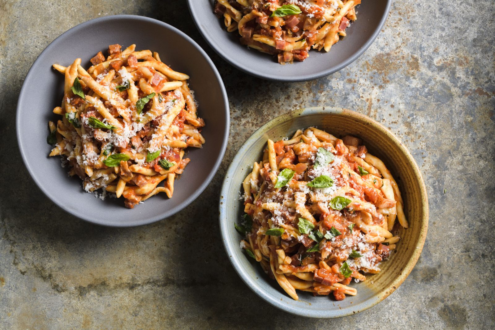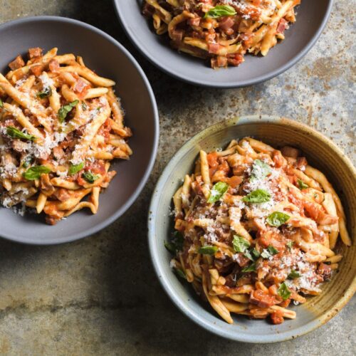 This substantial pasta dish comes from the Sila area of Calabria in southern Italy, a region known for bold, intensely flavorful ingredients. Pasta alla silana combines cured meats and two kinds of cheese, along with tomatoes, chili and onion. Classic versions also include porcini mushrooms, but we found the dish to be loaded with flavor without the porcini, so we left them out. The regional pasta for this is fileja, an elongated tubular shape formed by rolling dough around a slender rod. It’s difficult to find in the U.S., but penne works perfectly.