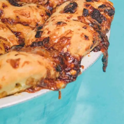 - When you have one layer of dough balls down, sprinkle about one-third of the remaining cheese and one-third of the remaining butter onions over the top.