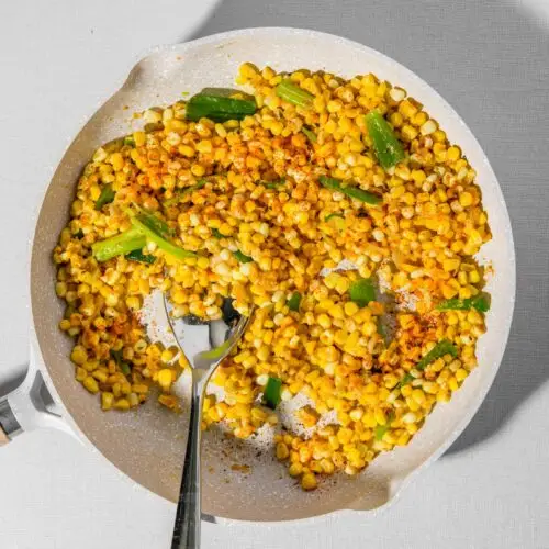 For this umami-filled, savory-sweet side dish, plump, tender kernels cut from ears of fresh sweet corn are the first choice, but out of season an equal amount of frozen corn kernels that have been thawed and patted dry will work; they’ll just take a few minutes longer to brown. The optional furikake garnish adds even more layers of savory-sweet flavor (furikake is a Japanese condiment often sprinkled onto rice). Alternatively, add a little heat plus notes of sesame and citrus by sprinkling on some shichimi togarashi, or Japanese seven-spice blend.