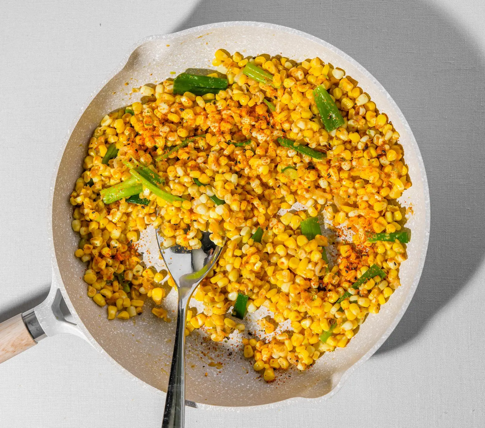 - Add the corn and scallion whites, then cook, stirring often, until the corn begins to brown, about 5 minutes.
