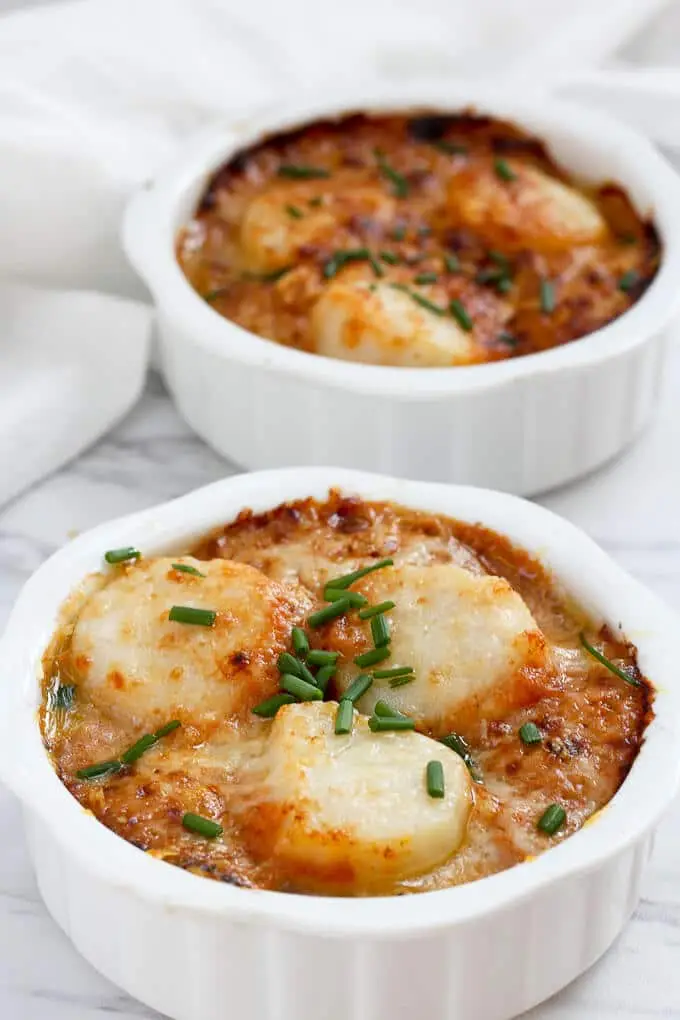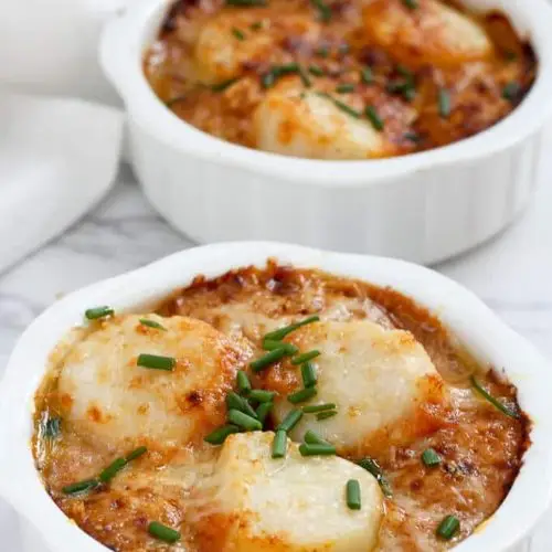 - Allow the ramekins to cool slightly, top with fresh chives (if desired) and serve your broiled scallop gratin while it’s still hot.