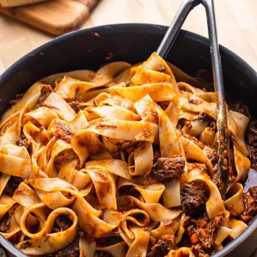 Short ribs with pappardelle is the ultimate comfort food that is perfect for cooler nights when all you want to do is cozy up with a warm bowl of pasta. Beef short ribs are braised in a tomato and red wine sauce then tossed with pappardelle ribbons and topped with Parmigiano Reggiano. This is the ragu to end all other ragus.