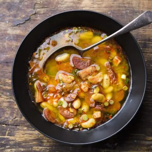 This is a quick-and-easy version of the Spanish tapa known as fabada asturiana, a hearty stew of dried beans, sausage, and other smoky, porky ingredients. We pared back on the meats, using only chorizo and ham, both of which lend deep flavor to the broth. The dish gets its name from the large beans that are traditionally used in its preparation, but we found that canned white beans worked well. We especially liked the relatively large size and creamy texture of cannellinis, but great northern and navy beans are fine, too. A pinch of saffron adds a very Spanish flavor and fragrance, while giving the stew an alluring golden hue.