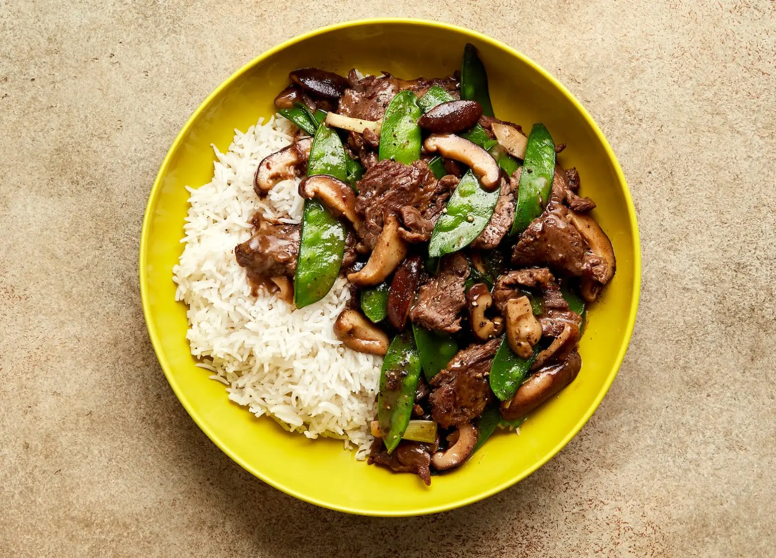 Velveting is a Chinese technique of coating slices of meat, usually beef, pork or chicken, with cornstarch or baking soda before cooking for tenderization. For this stir-fry, we use a little of both—the soda tenderizes more effectively while the cornstarch helps thicken the sauce. To ensure the beef is well-seasoned, we also stir in a little oyster sauce and soy sauce, then marinate for another 10 minutes. Shiitake mushrooms and snow peas round out the stir-fry. Serve with steamed rice.