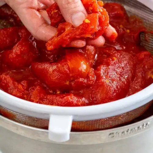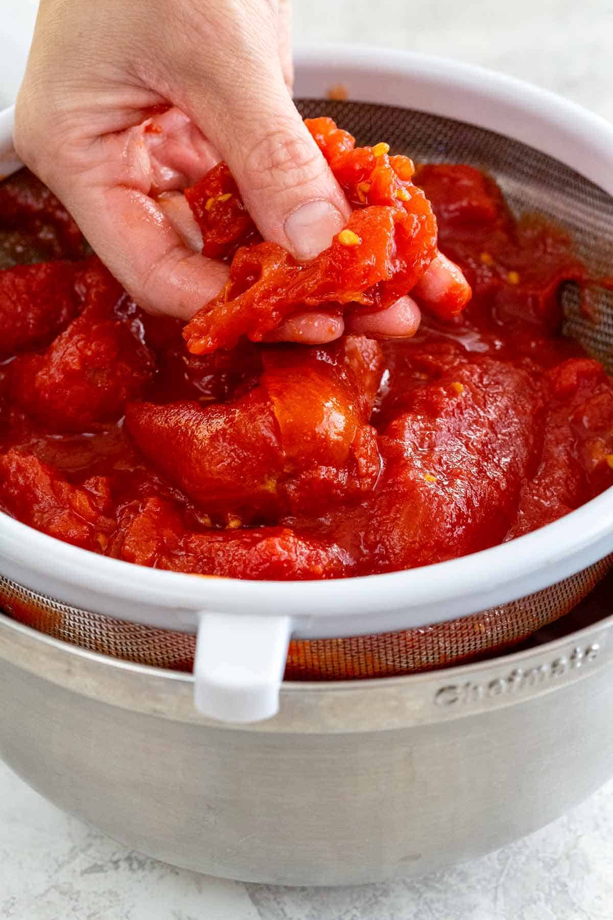 - Press gently on the tomatoes to strain as much liquid as possible.