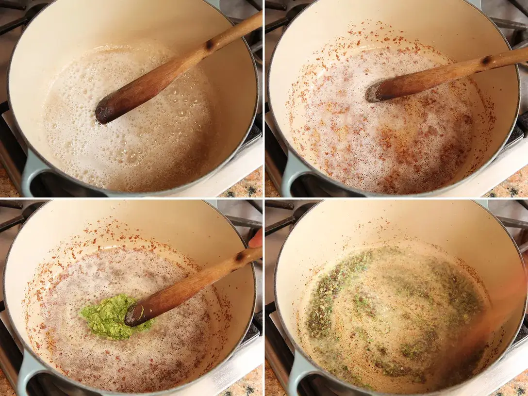 - Add the pounded garlic/ginger mixture and cook, stirring, until aromatic, about 30 seconds.