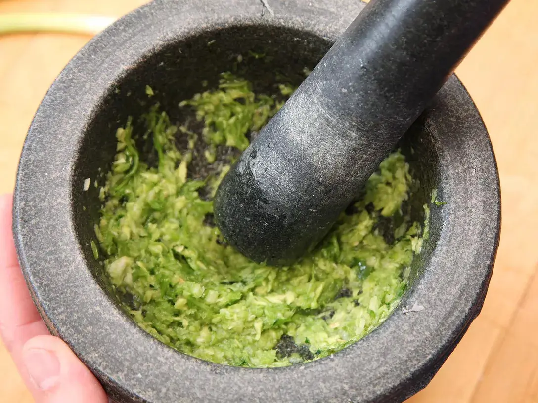 - A heavy-duty granite mortar and pestle will give you better flavor than a food processor or mini chopper, but a food processor can be used in place of a mortar and pestle if you do not own one.