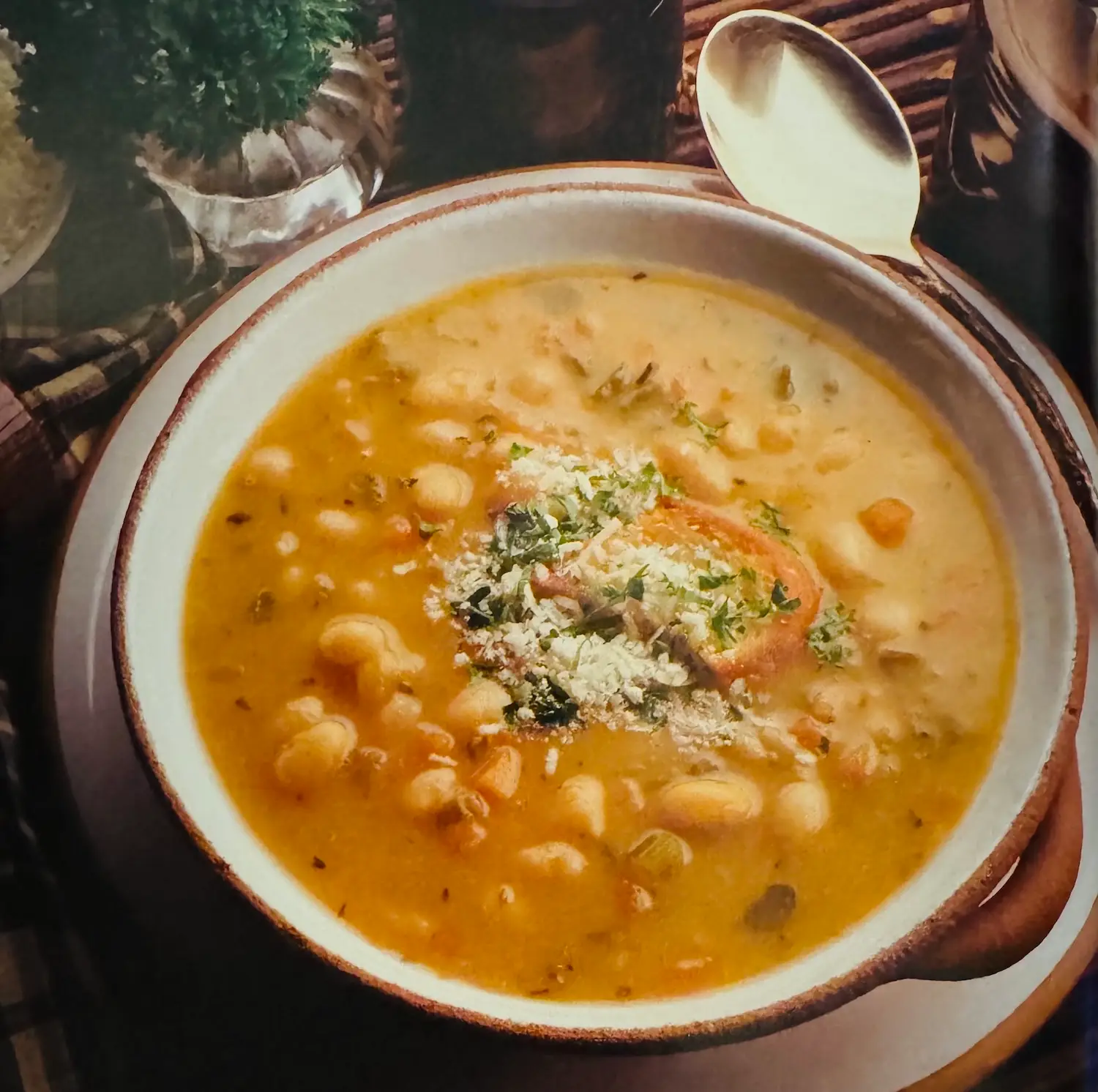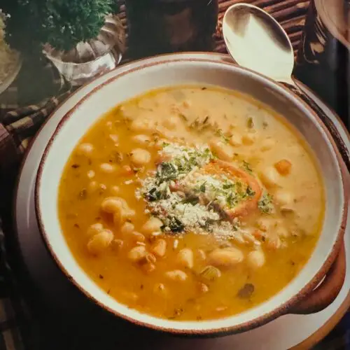 A sturdy soup that is a meal in itself, this is a popular dish in northern Italy, especially Tuscany, where the locals are nick-named mangiafagioli, or “bean eaters.” Feel free to substitute other dried beans such as chick-peas (garbanzo beans), white kidney beans or cannellini beans. If you like, garnish with croutons in addition to the Parmesan and parsley.