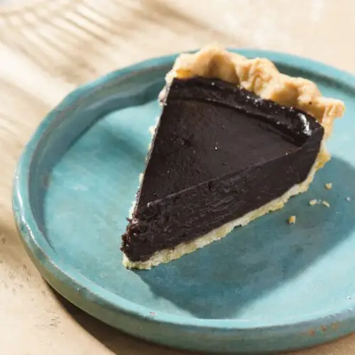Dutch-processed cocoa is the best type to use here, as the alkali added during processing gives it a deep, dark hue. That said, natural cocoa will work but the filling will be lighter in color. When lining the pie plate with the rolled dough, if the dough tears, not to worry, as it’s easy to patch. To prevent shrinking and slipping during baking, the foil-lined pie shell is filled with about 2 cups of pie weights. The weights are removed after about 20 minutes, then the pie shell is returned to the oven to allow it to brown all over.