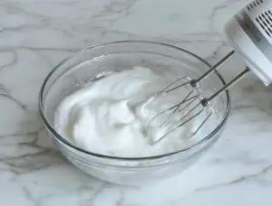 In the bowl of an electric mixer, beat the egg whites and salt until stiff peaks form.