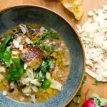Add the tomatoes, bay leaf, thyme, drained chickpeas, wine, and pork and add enough water to cover by about an inch.