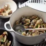 Serve with garlic crostini or over rice, linguini, or ramen noodles. Try adding some thai red chili paste in with the shallots or substituting half of the clams with mussels.