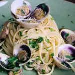 While the pasta is cooking, remove approximately 80% of the clams from their shells, adding them back to the pan, and discarding the shells. Set aside the clams that are still in their shells to add back while plating.