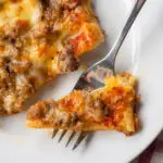 While crust is baking brown the sausage and ground beef over medium heat, breaking up the meat into as small of bits as possible with a spatula or spoon.