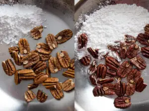 Sprinkle about half of the remaining powdered sugar into the skillet.