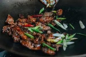 Let the sauce simmer for about 2 minutes and slowly stir in the cornstarch slurry mixture. Cook until the sauce has thickened enough to coat the back of a spoon.