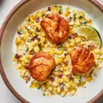 Divide corn mixture among plates and arrange scallops on top. Serve with lime wedges for squeezing over.