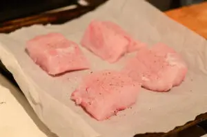 Cut the sea bass fillet(s) into 5-6 ounce portions and place each on a parchment paper lined baking sheet.