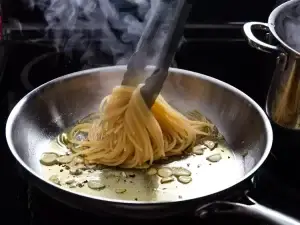 Transfer the pasta to the skillet along with ½ cup of the pasta water.